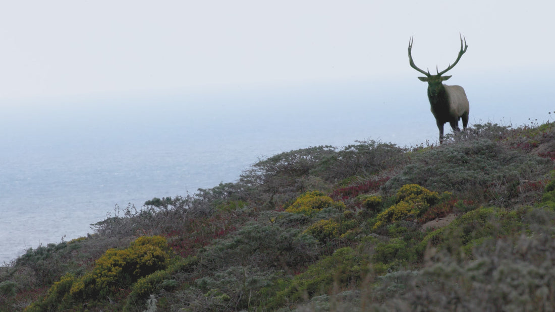 He ascended the hill with grace, his magnificent antlers gleaming in the sunlight. At the hill's summit, he paused, his powerful frame silhouetted against the endless expanse of the ocean. With a swift, majestic motion, he raked his horns against a tree, and then, as if putting on a performance just for me, he let out a resounding bugle that echoed through the air.